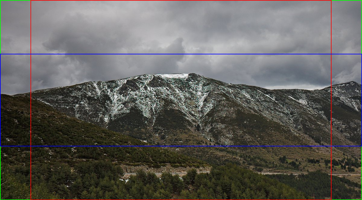 En este rectángulo podemos ver los tres tamaños, en verde APS-H, que ocuparía todo el negativo, en rojo APS-C y el azul APS-P. Si lo aplicamos a una imagen nos quedaría más o menos esto: