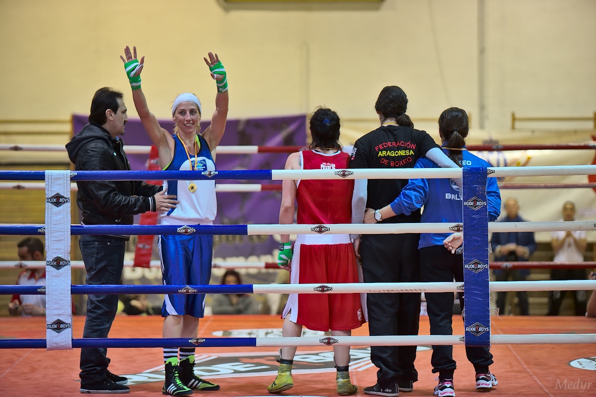 Combate por la medalla de oro en el campeonato de España de boxeo. Peso ligero (60 Kg). Púgiles: Soraya Rodriguez Rojo (rojo) y Jennifer Miranda Maqueda (azul). Ganadora por puntos Jennifer Miranda.