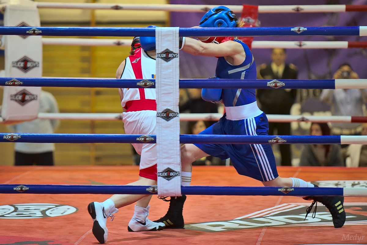 Combate por la medalla de oro en el campeonato de España de boxeo. Peso mosca (51 Kg). Púgiles: Eva Mª Naranjo Fernandez (rojo) y Marta Brañas Rumbo (azul). Ganadora por puntos Marta Brañas.